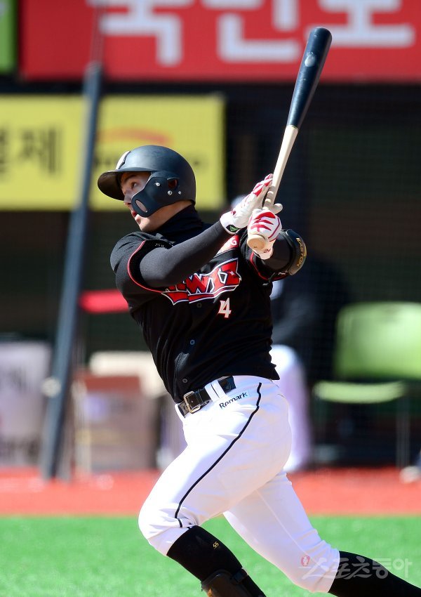 프로야구 개막이 4월 중으로 잠정연기된 가운데 KT가 16일 수원KT위즈파크에서 자체 청백전을 가졌다. 1회초 1사 3루 또리(어웨이)팀 김병희가 1타점 희생타를 치고 있다.