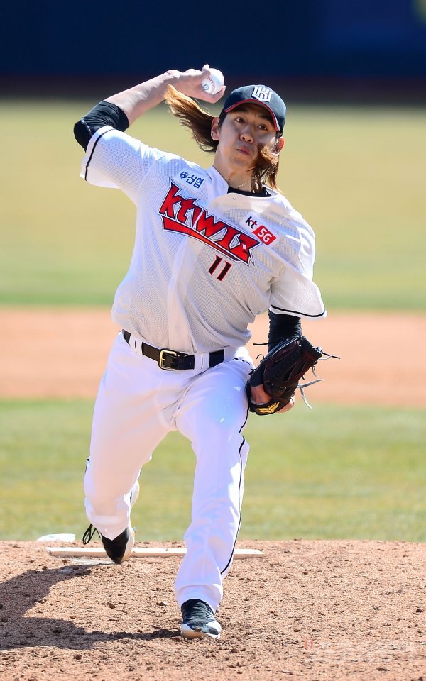 프로야구 개막이 4월 중으로 잠정연기된 가운데 KT가 16일 수원KT위즈파크에서 자체 청백전을 가졌다. 교체 등판한 빅(홈)팀 이대은이 역투하고 있다.