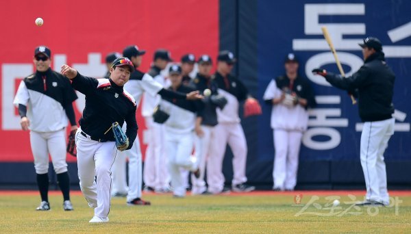 프로야구 개막이 4월 중으로 잠정 연기된 가운데 KT가 17일 수원KT위즈파크에서 훈련을 가졌다. 강백호가 외야 수비 훈련을 하고 있다.