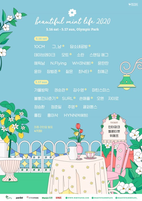 오는 5월 16일, 17일 양일간 올림픽공원에서 열리는 뷰티풀 민트 라이프 2020은 4월 7일 최종 라인업 발표를 앞두고 있다. 참고로 지난 1차 라인업을 통해 10CM, 데이브레이크, 소란, 윤하, 에릭남, 정승환, 정준일, 페퍼톤스, 폴킴 등 쟁쟁한 20팀의 아티스트를 공개한 바 있다. 티켓은 인터파크, 멜론티켓, 위메프를 통해 판매 중이고, 보다 자세한 정보는 뷰티풀 민트 라이프의 어플리케이션 및 SNS, 주최사인 민트페이퍼 홈페이지 등을 통해 확인이 가능하다.