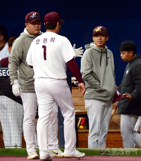프로야구 개막이 4월 중으로 잠정 연기된 가운데 키움 히어로즈가 18일 서울 고척스카이돔에서 청백전을 가졌다. 2회초 등판한 홈팀 한현희가 호투를 펼치고 더그아웃으로 들어오자 손혁 감독이 반기고 있다.
