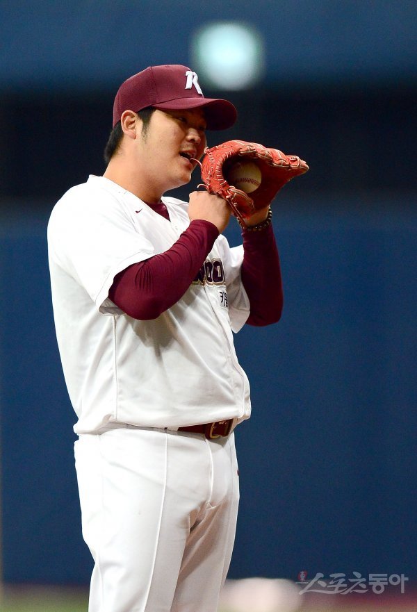 프로야구 개막이 4월 중으로 잠정 연기된 가운데 키움 히어로즈가 18일 서울 고척스카이돔에서 청백전을 가졌다. 2회초 등판한 홈팀 한현희가 글러브 끈을 조이고 있다.