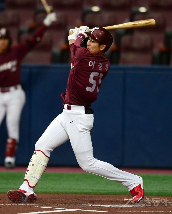 프로야구 개막이 4월 중으로 잠정 연기된 가운데 키움 히어로즈가 18일 서울 고척스카이돔에서 청백전을 가졌다. 1회초 2사 원정팀 이정후가 중전 안타를 치고 있다.
