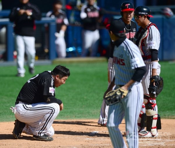 프로야구 개막이 4월 중으로 잠정 연기된 가운데 LG 트윈스가 22일 서울 잠실야구장에서 자체 정백전을 가졌다. 5회초 2사 1,2루 원정팀 좌전 안타 때 1루주자 김현수가 홈까지 달렸으나 아웃되며 포수 글러브에 얼굴을 맞아 고통스러워하고 있다.
