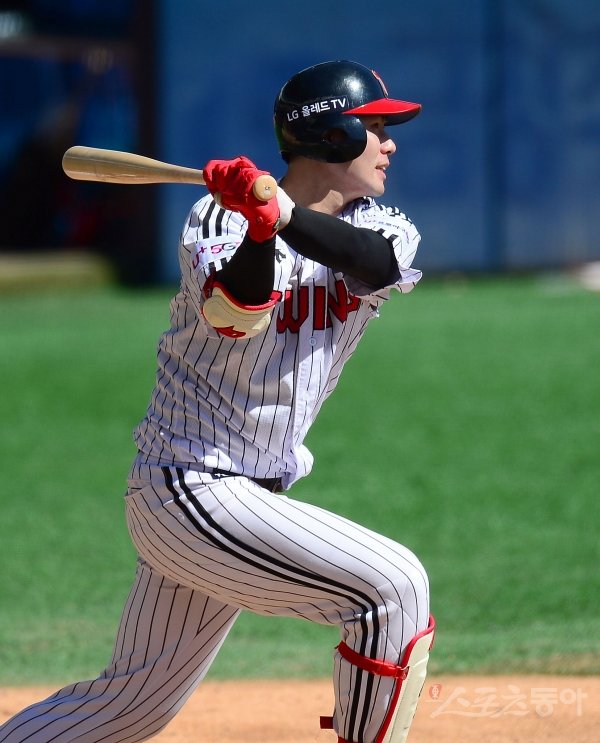 프로야구 개막이 4월 중으로 잠정 연기된 가운데 LG 트윈스가 22일 서울 잠실야구장에서 자체 정백전을 가졌다. 4회말 2사 1,2루 홈팀 홍창기가 2타점 중전 3루타를 치고 있다.