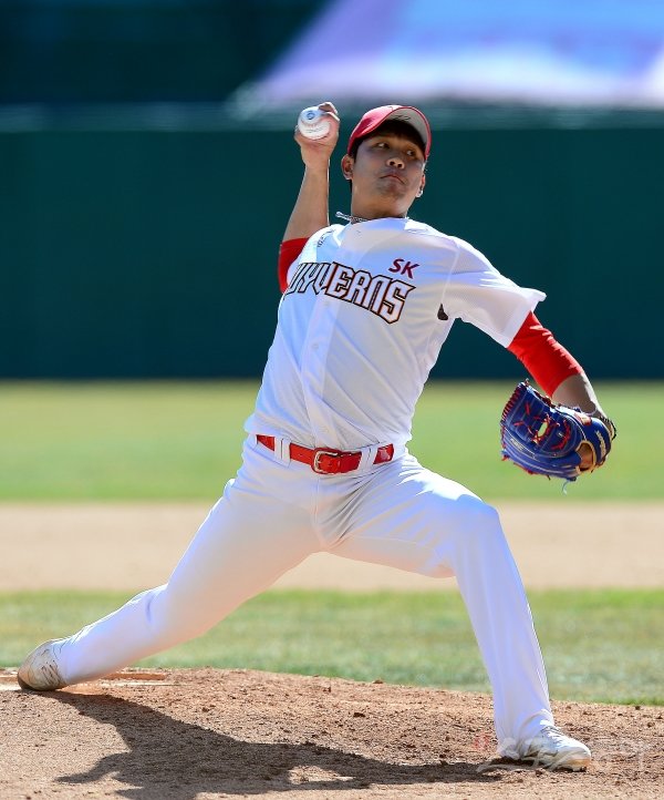 22일 인천 SK행복드림구장에서 SK 와이번스가 청백전 경기를 가졌다. 8회초 무사에서 SK 서진용이 힘차게 볼을 던지고 있다.