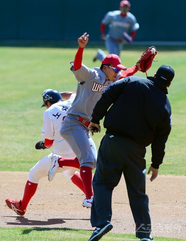 22일 인천 SK행복드림구장에서 SK 와이번스가 청백전 경기를 가졌다. 1회말 1사 1루에서 노수광이 2루 도루에 성공하고 SK 있다.