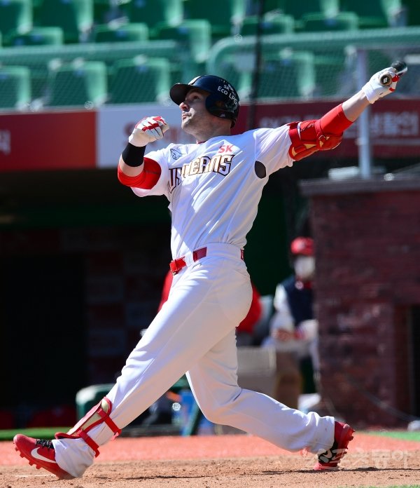 22일 인천 SK행복드림구장에서 SK 와이번스가 청백전 경기를 가졌다. 6회말 1사 1루에서 SK 로맥이 투런 홈런을 쏘아 올리고 있다.