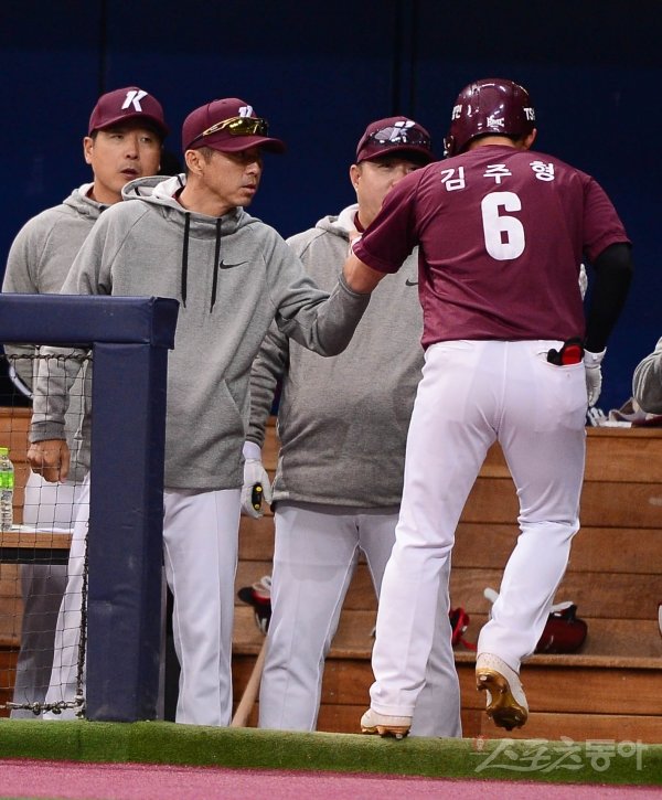 신종 코로나19 확산으로 프로야구 개막일이 4월로 늦춰진 가운데 키움 히어로즈가 22일 서울 구로구 고척스카이돔에서 청백전을 가졌다. 손혁 감독이 2회초 1사 솔로포를 치고 더그 아웃으로 들어오는 원정팀 김주형과 주먹을 맞대고 있다.