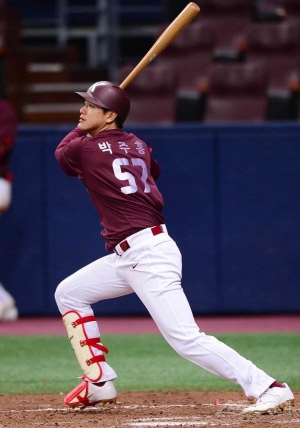 신종 코로나19 확산으로 프로야구 개막일이 4월로 늦춰진 가운데 키움 히어로즈가 22일 서울 구로구 고척스카이돔에서 청백전을 가졌다. 5회초 2사 1, 2루 원정팀 박주홍이 1타점 적시타를 치고 있다.