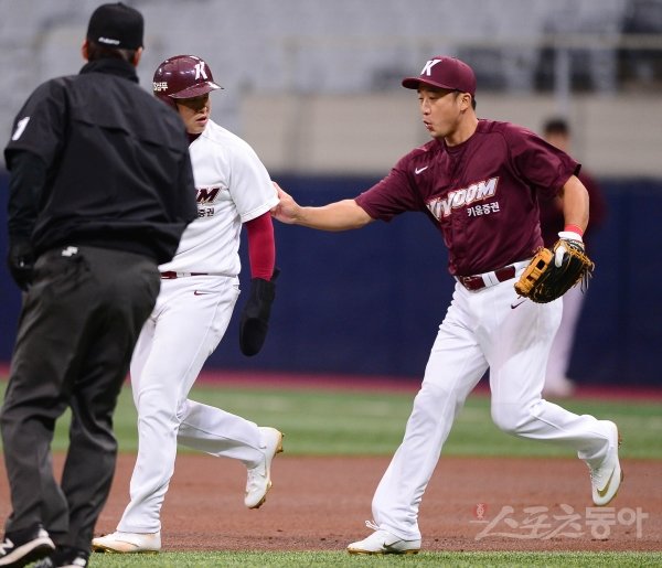 신종 코로나19 확산으로 프로야구 개막일이 4월로 늦춰진 가운데 키움 히어로즈가 22일 서울 구로구 고척스카이돔에서 청백전을 가졌다. 1회말 2사 1, 3루 원정팀 이택근이 김웅빈을 태그 아웃하고 있다.