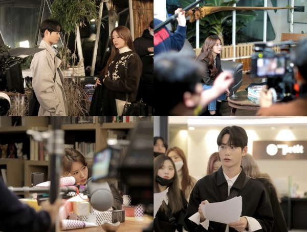 또 현장 스틸컷에서는 한창 촬영에 몰두한 윤보미와 대본을 들고 리허설을 하는 이세진의 훈훈한 비주얼이 보는 이들의 시선을 사로잡는다. 특히 두 사람이 함께 서 있는 스틸컷에서는 묘한 분위기를 자아내 호기심을 불러일으킨다.
