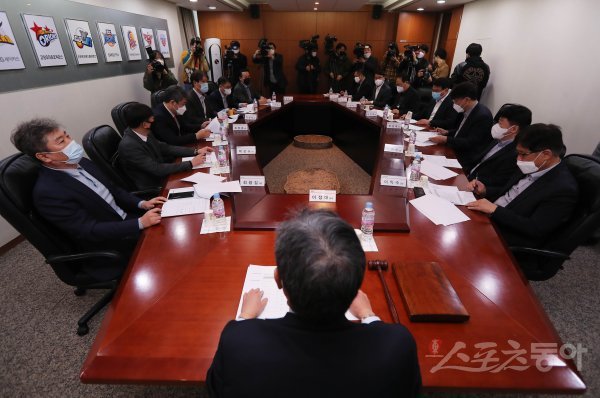 KBL 이사회가 24일 서울 강남구 논현동 KBL센터에서 열렸다. 한국남자프로농구(KBL)는 신종 코로나19 확산 방지를 위해 지난 4주간 리그 중단 후 재개 여부와 후속 사항에 대해 논의하고 있다.