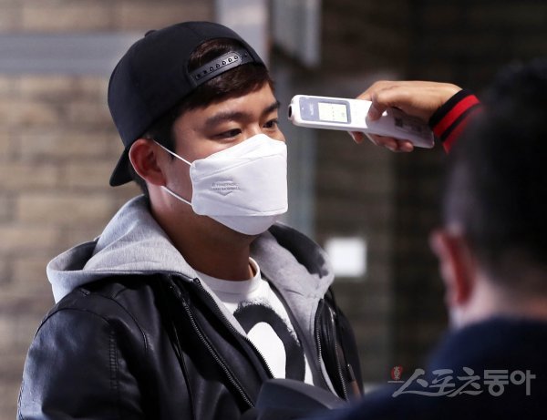 프로야구 개막일이 4월로 늦춰진 가운데 LG 트윈스가 24일 서울 송파구 잠실야구장에서 청백전을 가진다. LG 트윈스 김민성이 체온 체크를 하고 있다.