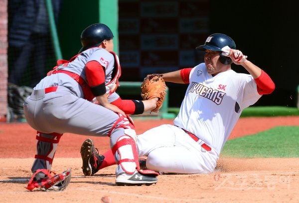 24일 인천 SK행복드림구장에서 SK 와이번스가 청백전 경기를 가졌다. 2회말 1사 2, 3루에서 SK 백팀 김창평의 2타점 2루타 때 2루 주자 이재원이 득점에 성공하고 있다.