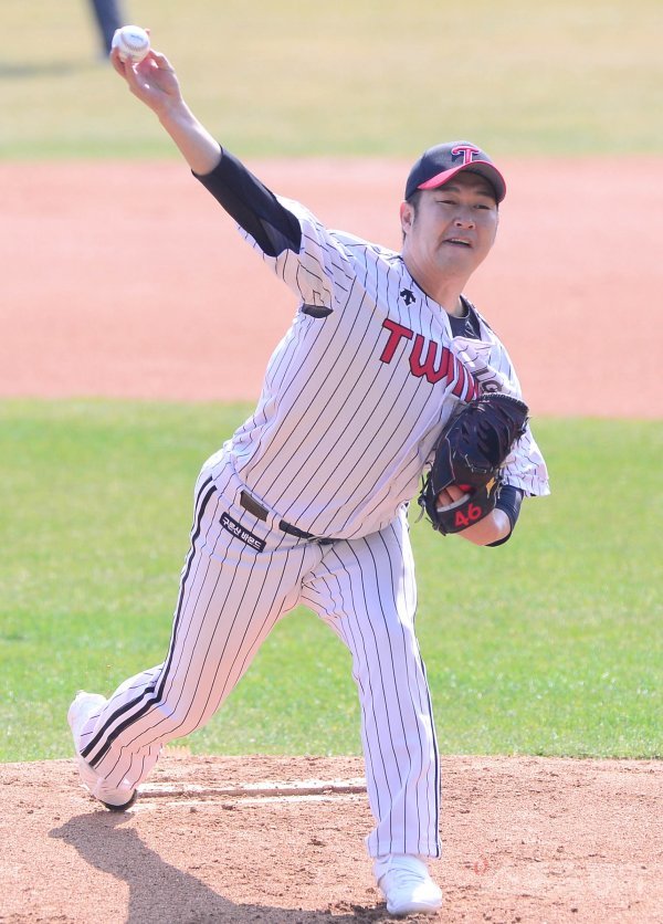 프로야구 개막일이 4월로 늦춰진 가운데 LG 트윈스가 24일 서울 송파구 잠실야구장에서 청백전을 가졌다. 1회초 선발 등판한 LG팀 송은범이 역투하고 있다.