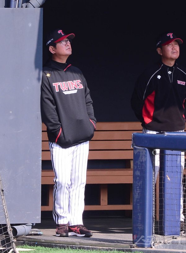 프로야구 개막일이 4월로 늦춰진 가운데 LG 트윈스가 24일 서울 송파구 잠실야구장에서 청백전을 가졌다. LG 류중일 감독이 파울된 공을 바라보고 있다.