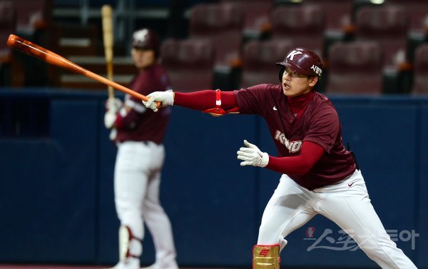 프로야구 개막이 4월 20일 이후로 잠정 연기된 가운데 키움 히어로즈가 24일 서울 고척스카이돔에서 자체 정백전을 가졌다. 4회초 무사 1,2루 원정팀 김웅빈이 1타점 중전 안타를 치고 있다.