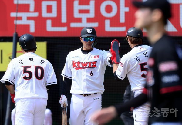 25일 경기도 수원 kt위즈파크에서 kt위즈의 청백전 경기가 열렸다. 1회말 무사 2, 3루에서 kt 빅팀 유한준의 2타점 2루타 때 득점에 성공한 강백호, 김민혁이 박경수의 환영을 받고 있다.