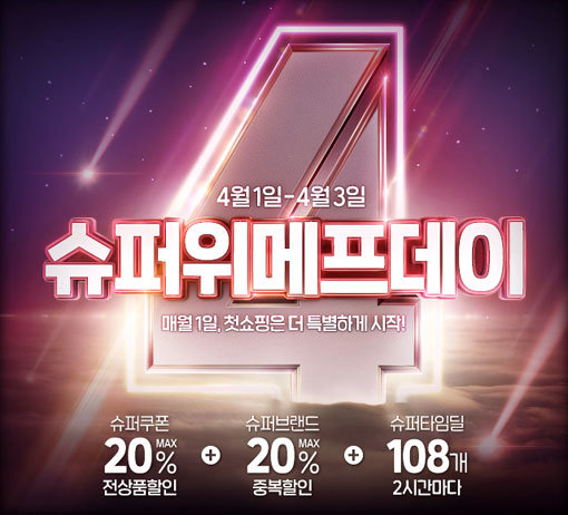 위메프는 4월 1일부터 3일까지 ‘슈퍼위메프데이’를 열고, 인기 브랜드의 제휴 할인을 제공한다. CJ제일제당, 삼성전자, P&G, 달바 등 34개 브랜드가 참여하는 슈퍼브랜드관에선 20% 할인 혜택을 준다. 카테고리별 중복 쿠폰 할인 혜택도 있다. 마트와 패션·뷰티는 최대 20%, 비배송상품(여행·e쿠폰)은 최대 15%까지 할인한다. 슈퍼위메프데이 핵심 코너인 타임딜도 진행한다. 2시간마다 테마별로 3개씩 오픈하며 3일간 총 108개 초특가 상품을 선보인다.