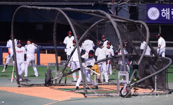 프로야구가 4월 7일부터 인접 구단 간 연습경기를 계획한 가운데 LG 트윈스가 29일 서울 송파구 잠실야구장에서 훈련을 가졌다. LG 야수들이 타격 훈련을 하고 있다.