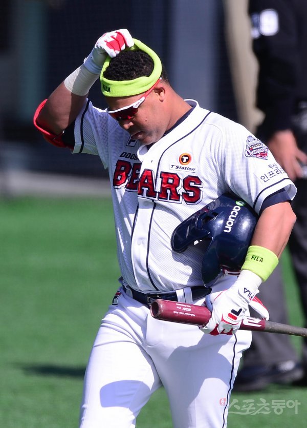 프로야구가 4월 7일부터 인접 구단 간 연습경기를 계획한 가운데 두산 베어스가 29일 서울 송파구 잠실야구장에서 청백전을 가졌다. 4회말 2사 백팀 페르난데스가 삼진 아웃을 당한 뒤 머리띠를 벗고 있다.