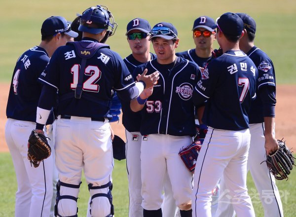 프로야구가 4월 7일부터 인접 구단 간 연습경기를 계획한 가운데 두산 베어스가 29일 서울 송파구 잠실야구장에서 청백전을 가졌다. 청팀 선수들이 3-1 역전승을 한 후 기쁨을 나누고 있다.