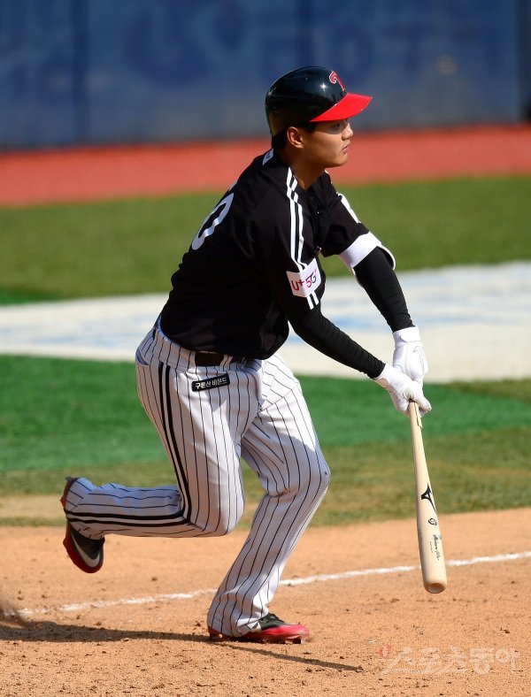 프로야구 개막이 4월 20일 이후로 잠정 연기된 가운데 LG 트윈스가 30일 서울 잠실야구장에서 자체 정백전을 가졌다. 7회초 2사 3루 대타 손호영이 1타점 우전 안타를 치고 있다.