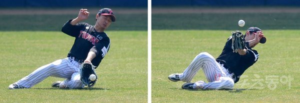 프로야구 개막이 4월 20일 이후로 잠정 연기된 가운데 LG 트윈스가 30일 서울 잠실야구장에서 자체 정백전을 가졌다. 4회말 무사 1루 청팀 신민재가 홈팀 김현수의 타구를 잡으려했으나 놓치고 있다.