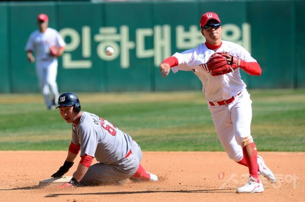 30일 인천 SK행복드림구장에서 SK 와이번스 자체 연습 경기가 열렸다. 6회초 1사 1루에서 SK 퓨처스 최항의 내야 땅볼 때 1루 주자 이거연이 2루에서 수펙스팀 정현에게 포스 아웃되고 있다.