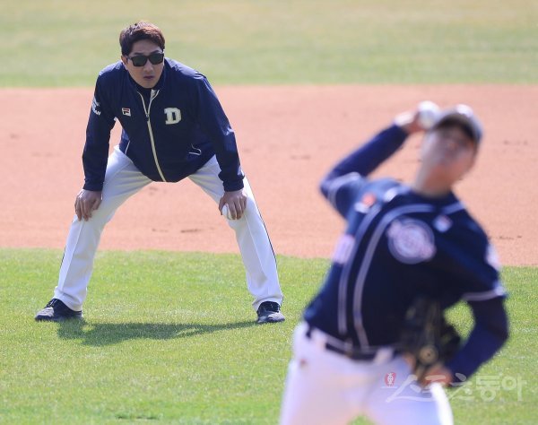 프로야구가 4월 7일부터 인접 구단 간 연습경기를 계획한 가운데 두산 베어스가 31일 서울 송파구 잠실야구장에서 청백전을 가졌다. 1회말 두산 관계자가 자체 심판을 보며 이영하의 투구를 보고 있다.