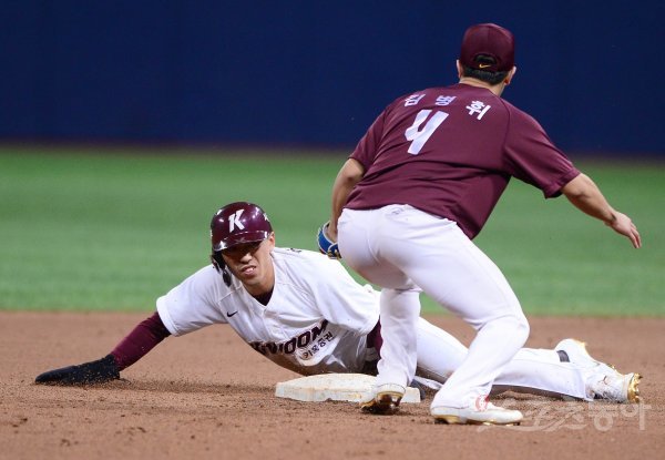 6회말 2사 1루 상황에서 1루주자 박정음이 2루 도루에 성공하고 있다.