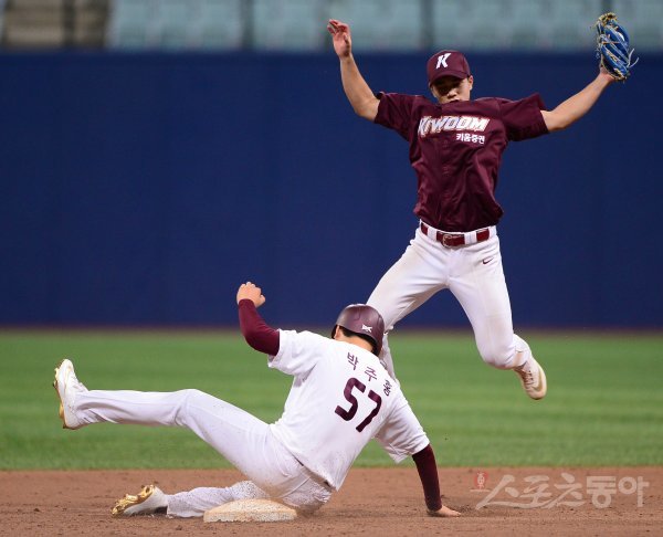 7회말 1사 1루 상황에서 1루주자 홈팀 박주홍이 도루에 성공하고 있다.