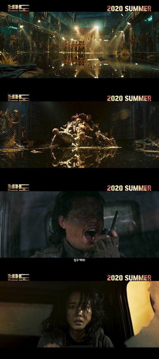 각종 플랫폼을 통해 세계 최초로 공개된 ‘반도’ 1차 예고편은 전대미문의 재난 후, 4년이 지나 황폐해진 ‘반도’의 모습으로 시작된다. 거대 선박이 방치된 항구와 녹슨 차들만 남아있는 스산한 거리, 수백 명의 좀비가 서로 엉켜 갇힌 채 폐쇄된 지하철 역사, 사람의 흔적이라고는 찾을 수 없는 이곳은 더 이상 우리가 알던 도시의 모습이 아니다.