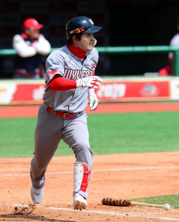 3회초 무사에서 SK 퓨처스팀 김성현이 타격을 펼친 뒤 1루로 달리고 있다.