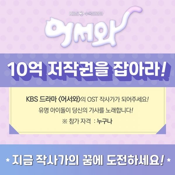 KBS2 수목드라마 ‘어서와’의 OST 제작사인 도너츠뮤직앤은 3일 “지난 2월 실시한 ‘제1회 도너츠뮤직앤 작사 공모전-10억 저작권을 잡아라!’의 당선작이 결정됐다”며 “최종 우승자는 ‘어서와’의 OST 중 몬스타엑스 기현이 부를 곡 ‘다시, 봄’의 작사가로 참여하게 된다”고 밝혔다.