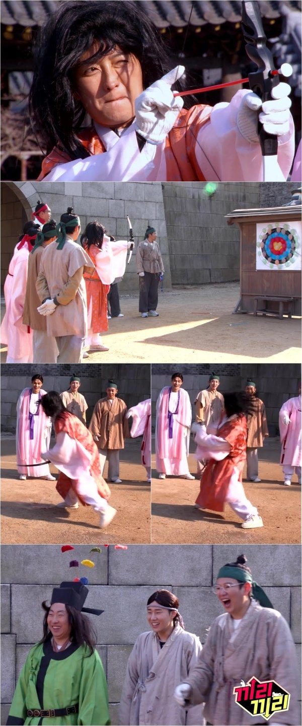 ‘끼리끼리’의 인교진이 무근본 무술 스킬을 선보인다. 그는 ‘인주몽’을 연상케 하는 화려한 궁술을 뽐내는가 하면 산발 머리를 흩날리는 검술로 현장을 발칵 뒤집는 등 남다른 활약을 보여주고 있어 웃음을 자아낸다.