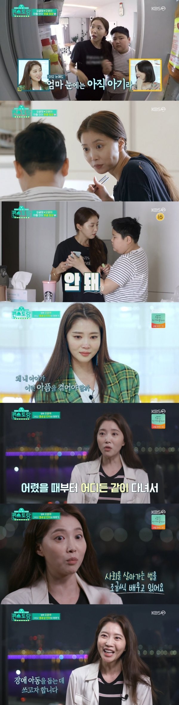 이날 오윤아는 싱글맘으로서 14살 아들 민이를 향한 뭉클한 사랑을 고백해 눈길을 끌었다. 오윤아는 민이가 처음 아팠을 때를 떠올리며 눈물을 흘렸다. 이어 최근 많이 좋아졌고, 민이의 사회성을 길러주기 위해 어릴 때부터 많이 데리고 다녔다고 털어놨다. 또 만약 자신이 ‘편스토랑’에서 우승을 한다면, 수익금이 민이 같은 장애 아동들을 위해 사용됐으면 좋겠다고 밝혀 감동을 선사했다.