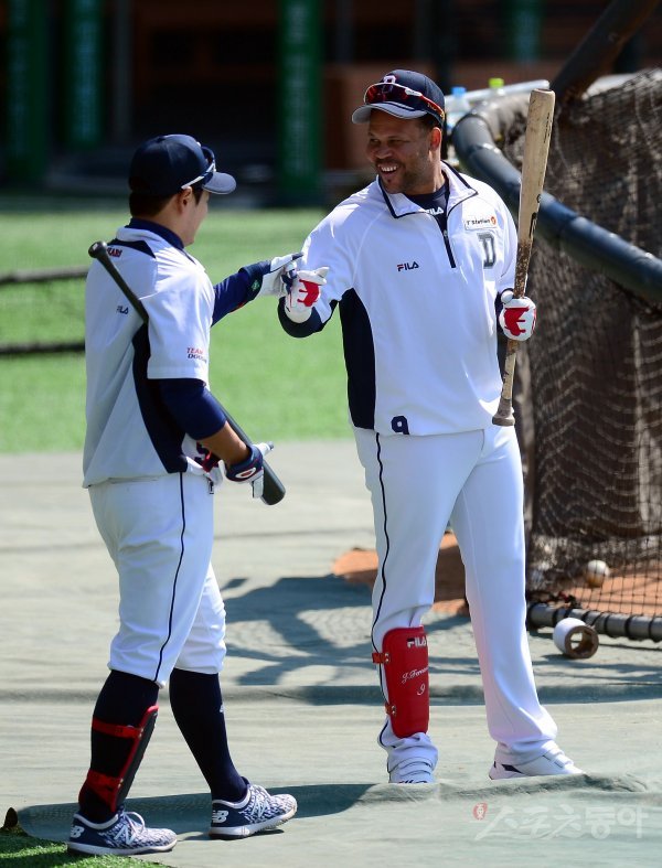 프로야구 개막이 잠정 연기된 가운데 두산 베어스가 5일 서울 잠실야구장에서 훈련을 가졌다. 페르난데스가 최주환과 주먹을 맞대고 있다.