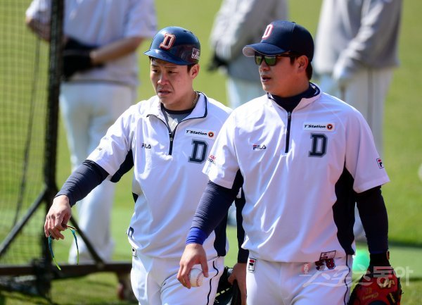 프로야구 개막이 잠정 연기된 가운데 두산 베어스가 5일 서울 잠실야구장에서 훈련을 가졌다. 박세혁과 정상호가 이야기를 나누고 있다.