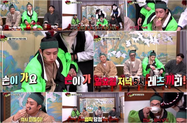 이 가운데 은지원은 부각을 국에 적셔 먹는 꼼수를 자랑해 감탄을 불렀고 조용히 식사를 하던 박명수는 점점 낙서로 채워지는 ‘늘끼리’의 얼굴에 웃음이 터졌다. 이에 달려오는 포졸군단에 이수혁을 따라 그릇에 담긴 부각을 한입에 털어 넣는 모습으로 웃음을 자아냈다.