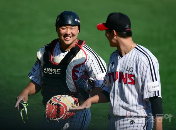 프로야구 개막이 잠정 연기된 가운데 LG 트윈스가 5일 서울 잠실야구장에서 자체 청백전을 가졌다. 수비를 마치고 LG팀 김성진이 투수와 이야기를 나누고 있다.