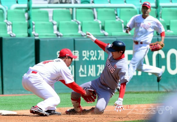 2회초 2사 만루에서 SK 퓨처스팀 최지훈이 3타점 2루타를 날린 뒤 3루까지 달리다 수펙스팀 최정에게 태그 아웃되고 있다.