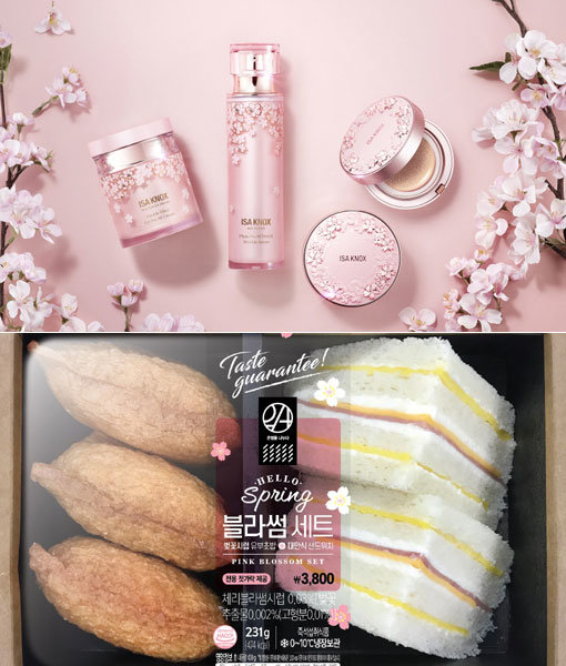 LG생활건강 ‘이자녹스 벚꽃 컬렉션 시즌5’(위)와 이마트24의 ‘블라썸세트’. 사진제공|LG생활건강·이마트24