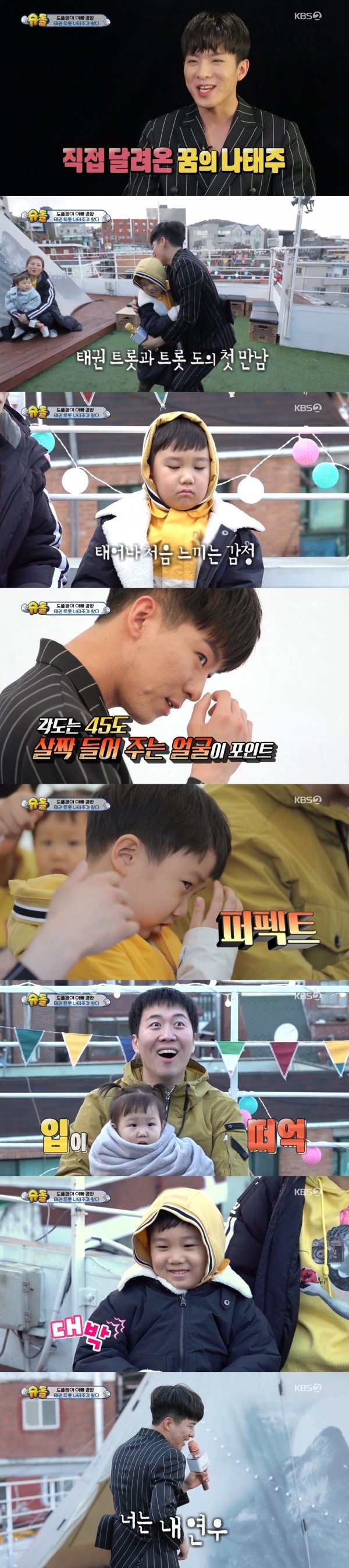 이는 연우의 꿈이자 롤모델로 알려진 나태주가 연우를 위해 직접 '슈돌'을 찾아온 것이다. "도연우가 부르면 달려갈 거야~"라고 센스있는 개사까지 선보이며 나타난 나태주. 그의 현란한 태권 트롯 무대는 모두의 눈을 번쩍 뜨이게 했다. 꿈을 직접 마주한 연우는 긴장한 나머지 눈도 제대로 못 마주쳤다. 급기야 눈물까지 흘렸다. 연우의 감격이 고스란히 담긴 순수한 반응이 보는 이들의 마음도 울컥하게 했다.