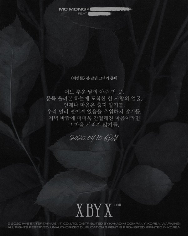 MC몽과 이병률 시인, 또 다른 아티스트의 콜라보로 한층 더 다채롭고 풍성한 감성을 자랑할 ‘X by X’ 첫 번째 프로젝트 음원 ‘봄 같던 그녀가 춥대’는 오는 10일 오후 6시 각종 온라인 음원 사이트를 통해 발매된다.