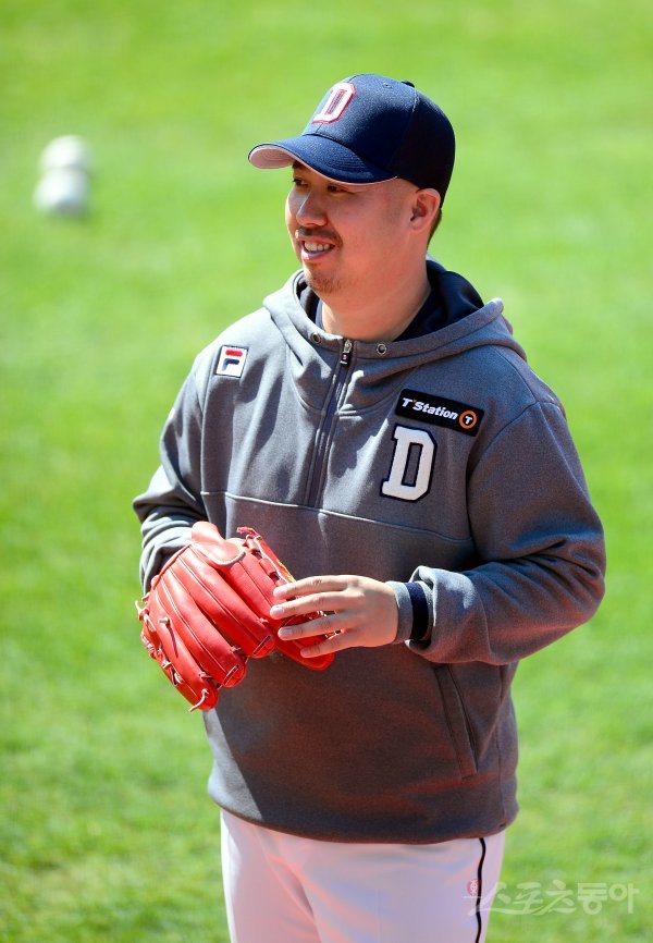 프로야구 개막이 잠정 연기된 가운데 두산 베어스가 8일 서울 잠실야구장에서 훈련을 가졌다. 유희관이 훈련 중 밝게 웃고 있다.