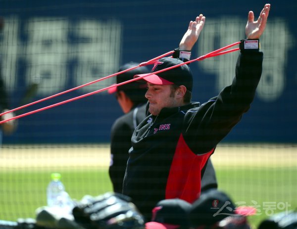 프로야구 개막이 잠정 연기된 가운데 LG 트윈스가 8일 서울 잠실야구장에서 훈련을 가졌다. 자가격리에서 해제되어 팀 훈련에 참가한 윌슨이 스트레칭을 하고 있다.