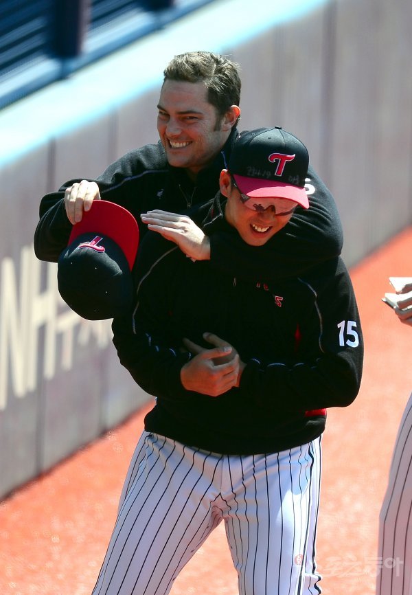 프로야구 개막이 잠정 연기된 가운데 LG 트윈스가 8일 서울 잠실야구장에서 훈련을 가졌다. 자가격리에서 해제되어 팀 훈련에 참가한 윌슨이 전민수와 장난을 치며 인사하고 있다.
