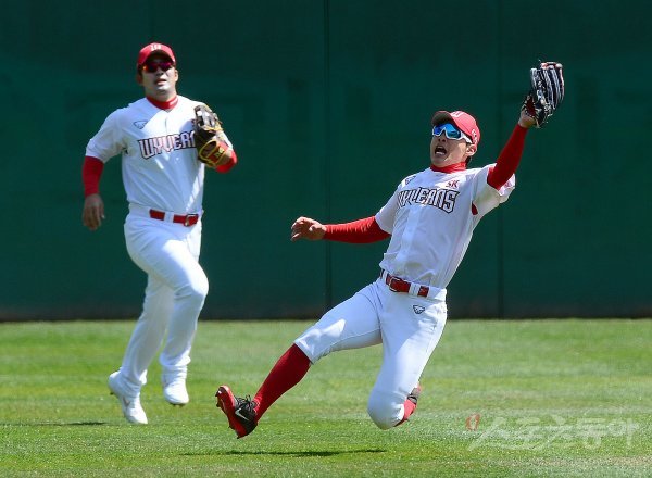 4회초 1사 3루에서 SK 퓨처스팀 노수광의 타구를 수펙스팀 최지훈이 잡아내고 있다.